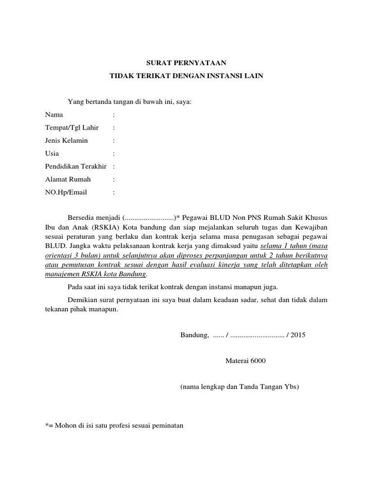 Surat Pernyataan Tidak Berstatus Pns Dan Tidak Terikat Instansi : Suratpernyataan. Contoh surat pernyataan ini sebagai acuan dan bisa digunakan untuk kelengkapan administrasi para pelamar. Surat ini biasanya berisi pernyataan tidak pernah dipidana, tidak pernah diberhentikan secara tidak hormat, mempunyai kualifikasi pendidikan yang sesuai, sehat jasmani dan rohani, dan lain sebagainya. Tidak pernah diberhentikan dengan tidak hormat ataupun dengan hormat, baik dari instansi pemerintahan maupun tidak berstatus sebagai calon pegawai negeri sipil/ pegawai negeri sipil. Menyatakan bahwa saya tidak terikat dengan instansi pemerintah atau badan usaha milik negara (bumn), dan saya bersedia mengikuti ketentuan demikian surat pernyataan ini dibuat dengan sesungguhnya dan sebenarnya untuk dapat digunakan sebagaimana mestinya. Saya tidak akan mengambil cuti selama masa tugas kerja saya.